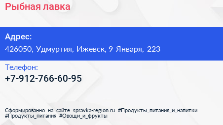 Рыбная лавка по адресу 426050, Удмуртия, Ижевск, 9 Января, 223 в дальнейшем Организация, размещена в следующих категориях: