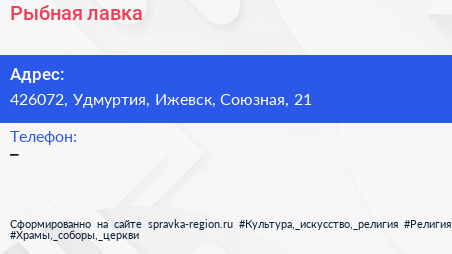 Рыбная лавка по адресу 426072, Удмуртия, Ижевск, Союзная, 21 в дальнейшем Организация, размещена в следующих категориях: