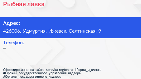 Рыбная лавка по адресу 426006, Удмуртия, Ижевск, Селтинская, 9 в дальнейшем Организация, размещена в следующих категориях: