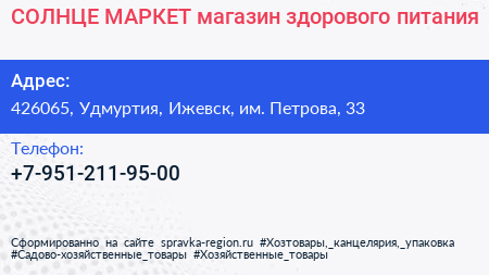 СОЛНЦЕ МАРКЕТ, магазин здорового питания по адресу 426065, Удмуртия, Ижевск, им. Петрова, 33 в дальнейшем Организация, размещена в следующих категориях: