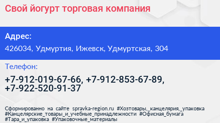 Свой йогурт, торговая компания по адресу 426034, Удмуртия, Ижевск, Удмуртская, 304 в дальнейшем Организация, размещена в следующих категориях: