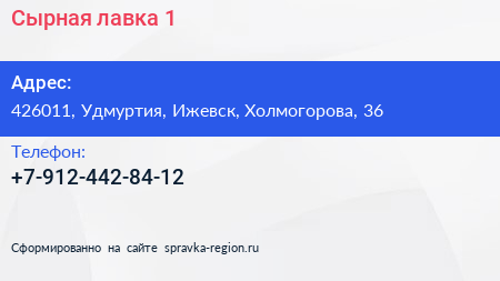 Сырная лавка №1 по адресу 426011, Удмуртия, Ижевск, Холмогорова, 36 в дальнейшем Организация, размещена в следующих категориях: