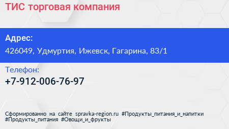 ТИС, торговая компания по адресу 426049, Удмуртия, Ижевск, Гагарина, 83/1 в дальнейшем Организация, размещена в следующих категориях: