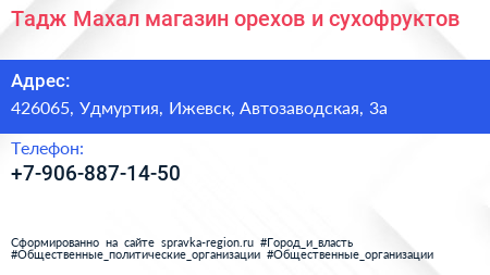 Тадж-Махал, магазин орехов и сухофруктов по адресу 426065, Удмуртия, Ижевск, Автозаводская, 3а в дальнейшем Организация, размещена в следующих категориях: