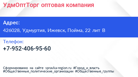 УдмОптТорг, оптовая компания по адресу 426028, Удмуртия, Ижевск, Пойма, 22 лит В в дальнейшем Организация, размещена в следующих категориях: