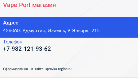 Vape Port, магазин по адресу 426060, Удмуртия, Ижевск, 9 Января, 215 в дальнейшем Организация, размещена в следующих категориях: