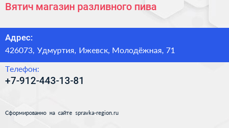 Вятич, магазин разливного пива по адресу 426073, Удмуртия, Ижевск, Молодёжная, 71 в дальнейшем Организация, размещена в следующих категориях: