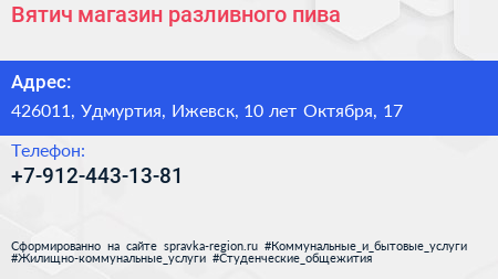 Вятич, магазин разливного пива по адресу 426011, Удмуртия, Ижевск, 10 лет Октября, 17 в дальнейшем Организация, размещена в следующих категориях: