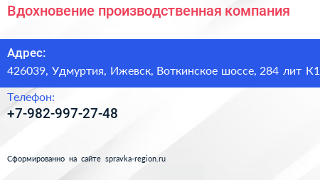 Вдохновение, производственная компания по адресу 426039, Удмуртия, Ижевск, Воткинское шоссе, 284 лит К14 в дальнейшем Организация, размещена в следующих категориях: