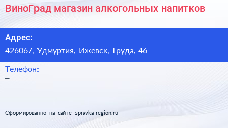 ВиноГрад, магазин алкогольных напитков по адресу 426067, Удмуртия, Ижевск, Труда, 46 в дальнейшем Организация, размещена в следующих категориях: