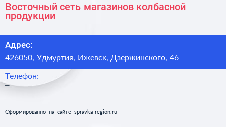 Восточный, сеть магазинов колбасной продукции по адресу 426050, Удмуртия, Ижевск, Дзержинского, 46 в дальнейшем Организация, размещена в следующих категориях:
