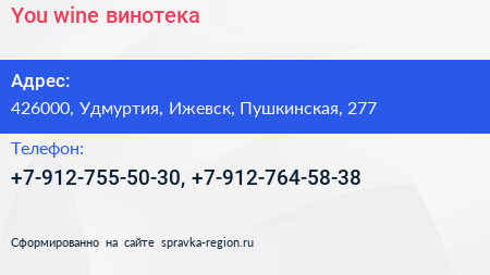 You & wine, винотека по адресу 426000, Удмуртия, Ижевск, Пушкинская, 277 в дальнейшем Организация, размещена в следующих категориях: