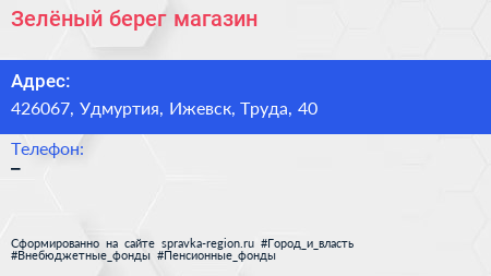 Зелёный берег, магазин по адресу 426067, Удмуртия, Ижевск, Труда, 40 в дальнейшем Организация, размещена в следующих категориях: