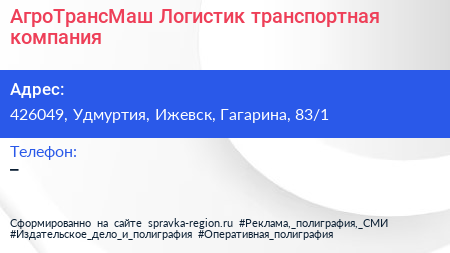АгроТрансМаш Логистик, транспортная компания по адресу 426049, Удмуртия, Ижевск, Гагарина, 83/1 в дальнейшем Организация, размещена в следующих категориях:
