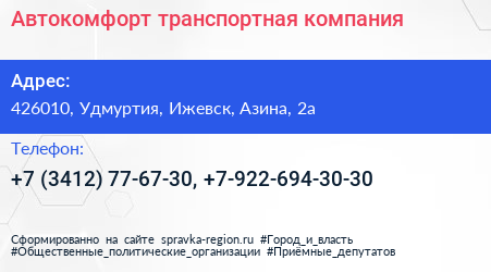Автокомфорт, транспортная компания по адресу 426010, Удмуртия, Ижевск, Азина, 2а в дальнейшем Организация, размещена в следующих категориях: