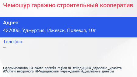 Чемошур, гаражно-строительный кооператив по адресу 427006, Удмуртия, Ижевск, Полевая, 10г в дальнейшем Организация, размещена в следующих категориях: