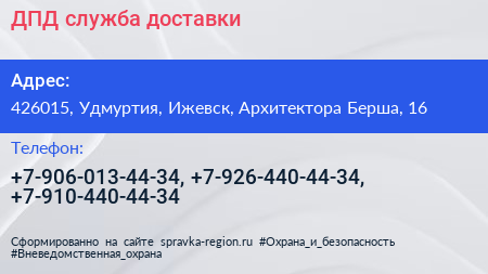 ДПД, служба доставки по адресу 426015, Удмуртия, Ижевск, Архитектора Берша, 16 в дальнейшем Организация, размещена в следующих категориях: