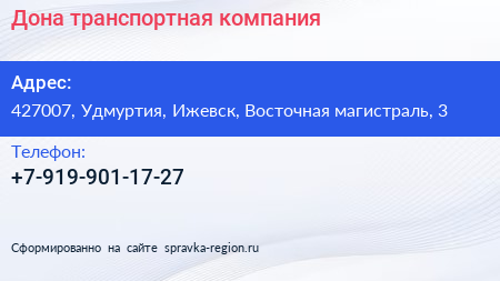 Дона, транспортная компания по адресу 427007, Удмуртия, Ижевск, Восточная магистраль, 3 в дальнейшем Организация, размещена в следующих категориях: