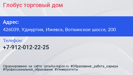 Глобус, торговый дом по адресу 426039, Удмуртия, Ижевск, Воткинское шоссе, 200 в дальнейшем Организация, размещена в следующих категориях: