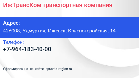 ИжТрансКом, транспортная компания по адресу 426008, Удмуртия, Ижевск, Красногеройская, 14 в дальнейшем Организация, размещена в следующих категориях: