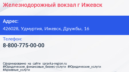 Железнодорожный вокзал, г. Ижевск по адресу 426028, Удмуртия, Ижевск, Дружбы, 16 в дальнейшем Организация, размещена в следующих категориях: