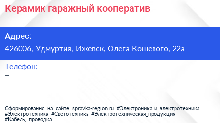 Керамик, гаражный кооператив по адресу 426006, Удмуртия, Ижевск, Олега Кошевого, 22а в дальнейшем Организация, размещена в следующих категориях: