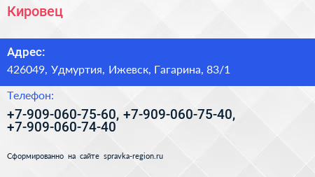 Кировец по адресу 426049, Удмуртия, Ижевск, Гагарина, 83/1 в дальнейшем Организация, размещена в следующих категориях:
