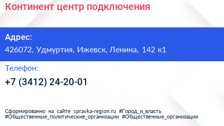 Континент, центр подключения по адресу 426072, Удмуртия, Ижевск, Ленина, 142 к1 в дальнейшем Организация, размещена в следующих категориях: