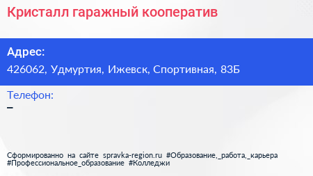 Кристалл, гаражный кооператив по адресу 426062, Удмуртия, Ижевск, Спортивная, 83Б в дальнейшем Организация, размещена в следующих категориях: