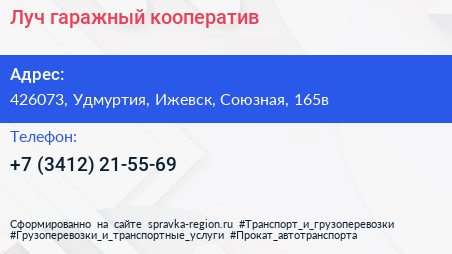Луч, гаражный кооператив по адресу 426073, Удмуртия, Ижевск, Союзная, 165в в дальнейшем Организация, размещена в следующих категориях: