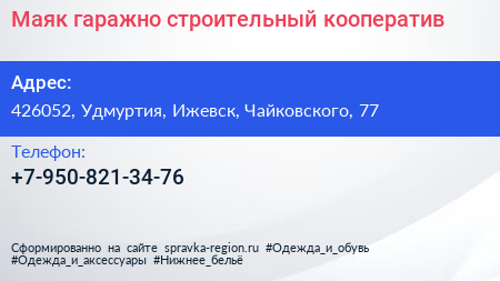 Маяк, гаражно-строительный кооператив по адресу 426052, Удмуртия, Ижевск, Чайковского, 77 в дальнейшем Организация, размещена в следующих категориях:
