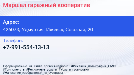 Маршал, гаражный кооператив по адресу 426073, Удмуртия, Ижевск, Союзная, 20 в дальнейшем Организация, размещена в следующих категориях: