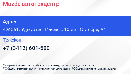 Mazda, автотехцентр по адресу 426061, Удмуртия, Ижевск, 10 лет Октября, 91 в дальнейшем Организация, размещена в следующих категориях: