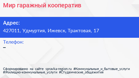 Мир, гаражный кооператив по адресу 427011, Удмуртия, Ижевск, Трактовая, 17 в дальнейшем Организация, размещена в следующих категориях: