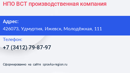 НПО ВСТ, производственная компания по адресу 426073, Удмуртия, Ижевск, Молодёжная, 111 в дальнейшем Организация, размещена в следующих категориях: