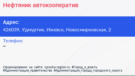 Нефтяник, автокооператив по адресу 426039, Удмуртия, Ижевск, Новосмирновская, 2 в дальнейшем Организация, размещена в следующих категориях: