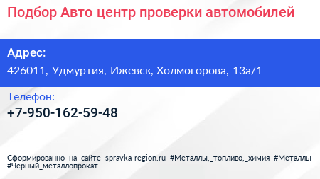 Подбор Авто, центр проверки автомобилей по адресу 426011, Удмуртия, Ижевск, Холмогорова, 13а/1 в дальнейшем Организация, размещена в следующих категориях: