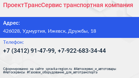 ПроектТрансСервис, транспортная компания по адресу 426028, Удмуртия, Ижевск, Дружбы, 18 в дальнейшем Организация, размещена в следующих категориях: