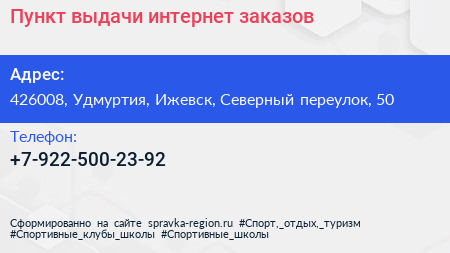 Пункт выдачи интернет-заказов по адресу 426008, Удмуртия, Ижевск, Северный переулок, 50 в дальнейшем Организация, размещена в следующих категориях: