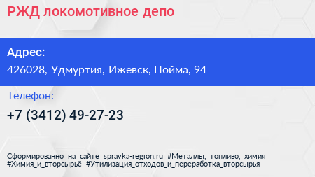 РЖД, локомотивное депо по адресу 426028, Удмуртия, Ижевск, Пойма, 94 в дальнейшем Организация, размещена в следующих категориях: