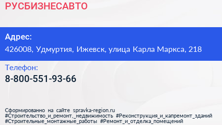 РУСБИЗНЕСАВТО по адресу 426008, Удмуртия, Ижевск, улица Карла Маркса, 218 в дальнейшем Организация, размещена в следующих категориях: