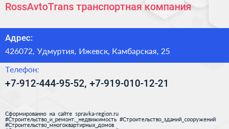 RossAvtoTrans, транспортная компания по адресу 426072, Удмуртия, Ижевск, Камбарская, 25 в дальнейшем Организация, размещена в следующих категориях: