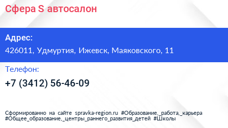 Сфера-S, автосалон по адресу 426011, Удмуртия, Ижевск, Маяковского, 11 в дальнейшем Организация, размещена в следующих категориях:
