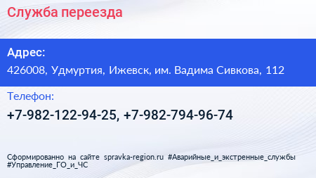 Служба переезда по адресу 426008, Удмуртия, Ижевск, им. Вадима Сивкова, 112 в дальнейшем Организация, размещена в следующих категориях: