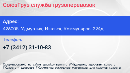 СоюзГруз, служба грузоперевозок по адресу 426008, Удмуртия, Ижевск, Коммунаров, 224д в дальнейшем Организация, размещена в следующих категориях: