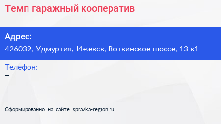 Темп, гаражный кооператив по адресу 426039, Удмуртия, Ижевск, Воткинское шоссе, 13 к1 в дальнейшем Организация, размещена в следующих категориях: