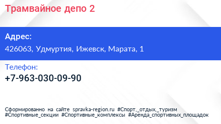 Трамвайное депо №2 по адресу 426063, Удмуртия, Ижевск, Марата, 1 в дальнейшем Организация, размещена в следующих категориях:
