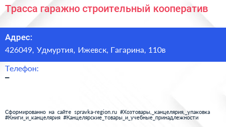 Трасса, гаражно-строительный кооператив по адресу 426049, Удмуртия, Ижевск, Гагарина, 110в в дальнейшем Организация, размещена в следующих категориях:
