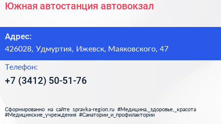 Южная автостанция, автовокзал по адресу 426028, Удмуртия, Ижевск, Маяковского, 47 в дальнейшем Организация, размещена в следующих категориях: