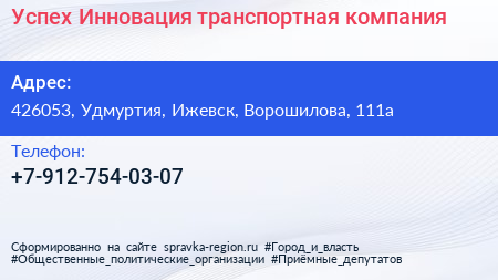 Успех Инновация, транспортная компания по адресу 426053, Удмуртия, Ижевск, Ворошилова, 111а в дальнейшем Организация, размещена в следующих категориях: